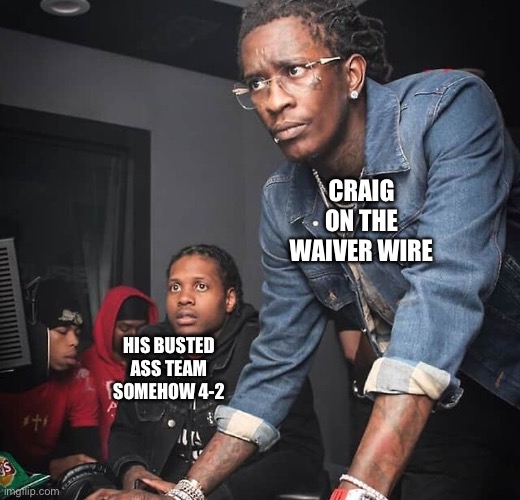 4. The Bonkers (4-2; Anthony DiMinno): No Lamar meant no chance for Ant and his crew; as needing to start Stafford proved to the final nail in the coffin for Ant in week 6 against Evan. If Lamar and Jonhston return, Ant’s team should be just fine as we approach the end to the first half of this season (already).