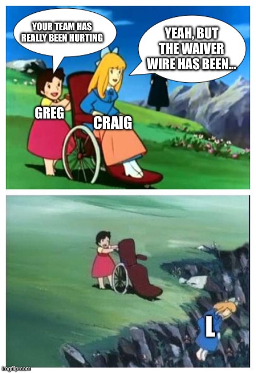 7. McConkey Kong (4-3; Craig Stalowski): You can only do so much when you’re so sick with the injury-bug, and the fever began to spike this past week against Greg; who gave no mercy. There’s plenty of time to get healthy and make some deals, which Craig has already been wheeling and dealing. Let’s see if Craig can limp into the playoffs, or begin to feel better by then.