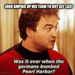 12. Justin Tucker is Le Tired (2-6; Pat Masur): Years go by, the seasons change, but one thing is for certain: Pat will always be in contention for the punishment. It’s just a guarantee of life. Pat is currently sitting 6th in PF but tops the league in PA; with his opponents averaging 144 against him. Things were no different against undefeated Evan, and Pat is, suddenly, back in a drivers seat he does not want to be in.