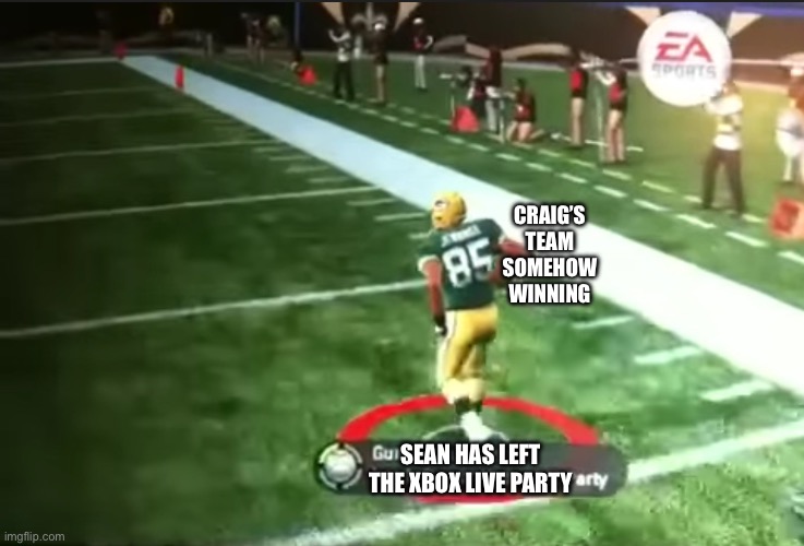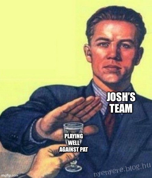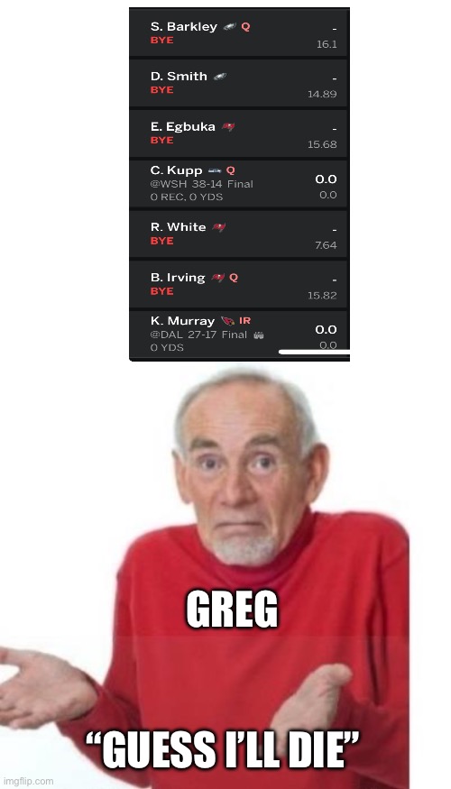 10. Sparta Waffle Eaters (4-5; Josh Tucci): Not a great week (YES IT WAS) for Mahomes, Taylor and Gibbs all to shit the bed, but that’s what happened to Josh. Now back under .500 this team is a roulette wheel when it comes to performance and consistency. Thankfully, Josh busted out and Pat also just ‘busted’.